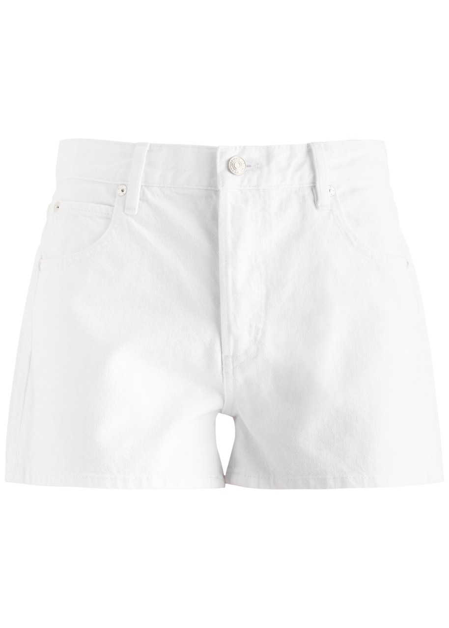 Info & Care Frame denim shorts Belt loops, five pockets, designer engraved hardware Partially concealed button and zip fastenings at front; 100% cotton; Machine wash cold inside out to avoid colour transfer; Size & Fit Length waist to hem: 11.5 inches/ 29cm; Midweight; Regular fit; Model is 5'9"/ 175cm and wears a size;W27