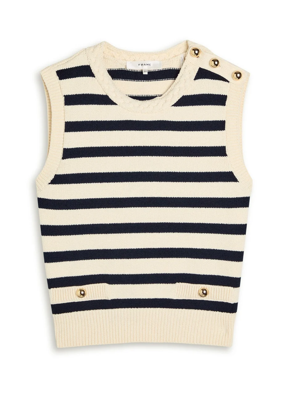 Info & Care Frame knit;tank Striped, round-neck with braided boucle trim, button-embellished shoulder, two faux button-fastening pockets at front, ribbed trims; Slips on 75% cotton, 25% polyamide Dry clean Size & Fit Length shoulder to hem: 19 inches/ 48.5cm Midweight Regular fit Model is 5'9"/ 175cm and wears a size small;;