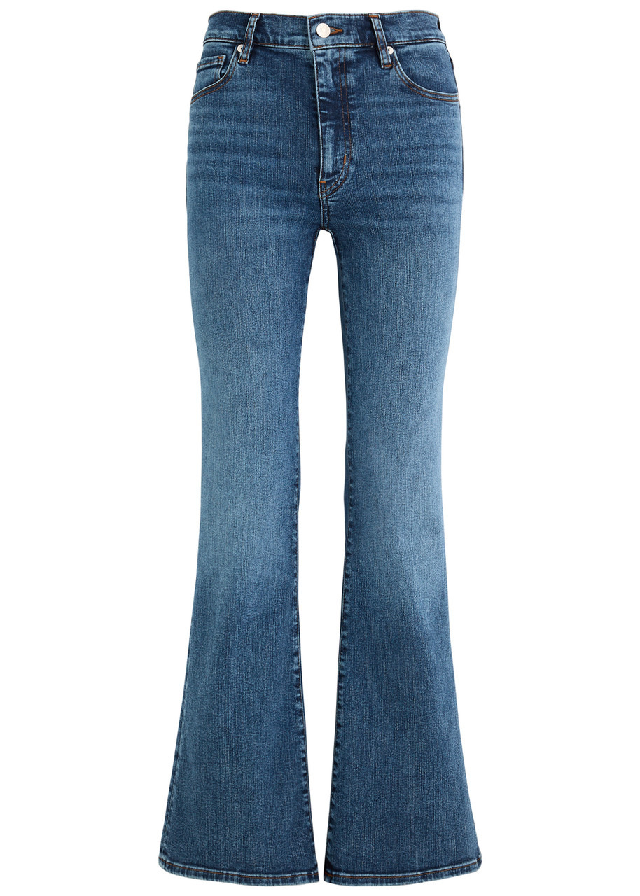 Info & Care Frame stretch-denim jeans Mid-rise fit, flared-leg cut, belt loops, five pockets, whiskered, contrasting stitching, faded finish Partially concealed zip and button fastenings at front 49% cotton, 21% pre consumer recycled cotton, 17% recycled polyester, 11% lyocell, 2% elastane Machine wash cold inside out to avoid colour transfer Size & Fit Front rise: 10 inches/ 25.5cm Inside leg length: 30.5 inches/ 77cm Midweight Model is 5'10"/ 178cm and wears a size W27