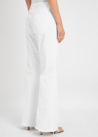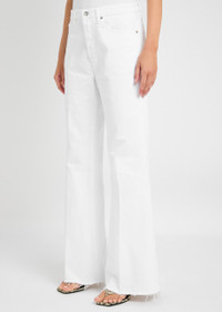 Info & Care Frame denim jeans Mid-rise fit, flared-leg cut, belt loops, five pockets, distressed cuffs, designer-engraved hardware Partially concealed button fastenings at front Designer wash:;White Raw Fray 100% cotton Machine wash cold to avoid colour transfer Size & Fit Front rise: 11 inches/ 38cm Inside leg length: 32 inches/ 81.5cm Midweight Model is 5'9"/ 175cm and wears a size W27