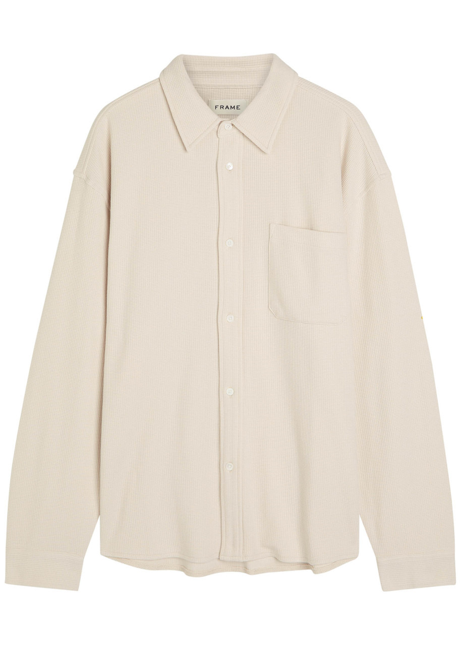 Info & Care Frame cotton shirt Waffle texture, dropped shoulders,;button-fastening cuffs, chest patch pocket, curved hem Button fastenings through front 100% cotton Machine wash Size & Fit Length shoulder to hem: 27 inches/ 68.5cm Midweight Relaxed fit Model is 6'2"/ 188cm, chest size 38 inches and wears a size medium