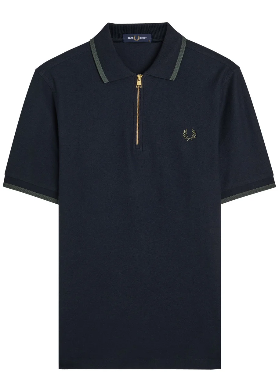 Info & Care Fred Perry cotton polo shirt Zip-fastening neck, embroidered designer crest, striped rib trims Slips on; 100% cotton; Size & Fit Length shoulder to hem: 27 inches/ 68.5cm Midweight Slim fit Model is 6'2"/ 188cm, chest size 38 inches and wears a size medium