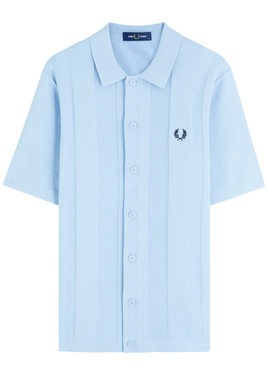 Info & Care Fred Perry cotton-knit polo shirt Striped intarsia at front, embroidered designer crest at chest, ribbed trims Button fastenings through front 100% cotton Machine wash Size & Fit Length shoulder to hem: 27 inches/ 68.5cm Midweight Regular fit, slim across shoulders Model is 6'2"/ 188cm, chest size 38 inches and wears a size medium