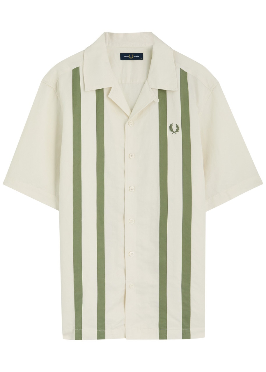 Info & Care Fred Perry woven shirt Camp collar, striped panels through front, logo embroidery at chest, side splits at hem Button fastenings through front 55% lyocell, 45% linen Machine wash Size & Fit Length shoulder to hem: 27 inches/ 68.5cm Midweight Relaxed fit Model is 6'1"/ 185cm, chest size 38.5 inches and wears a size medium