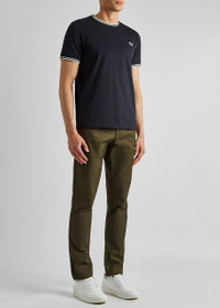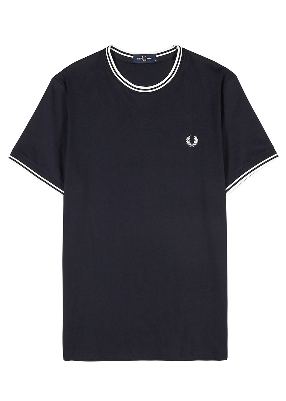 INFO & CARE - Fred Perry navy cotton T-shirt - Crew-neck white embroidered designer crest twin tipped ribbed trims - Slips on - 100% cotton SIZE & FIT - Machine wash - Length shoulder to hem: 28 inches/ 71cm - Midweight - Regular fit - Model is 6'1"/ 185cm chest size 38 inches and wears a size medium