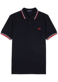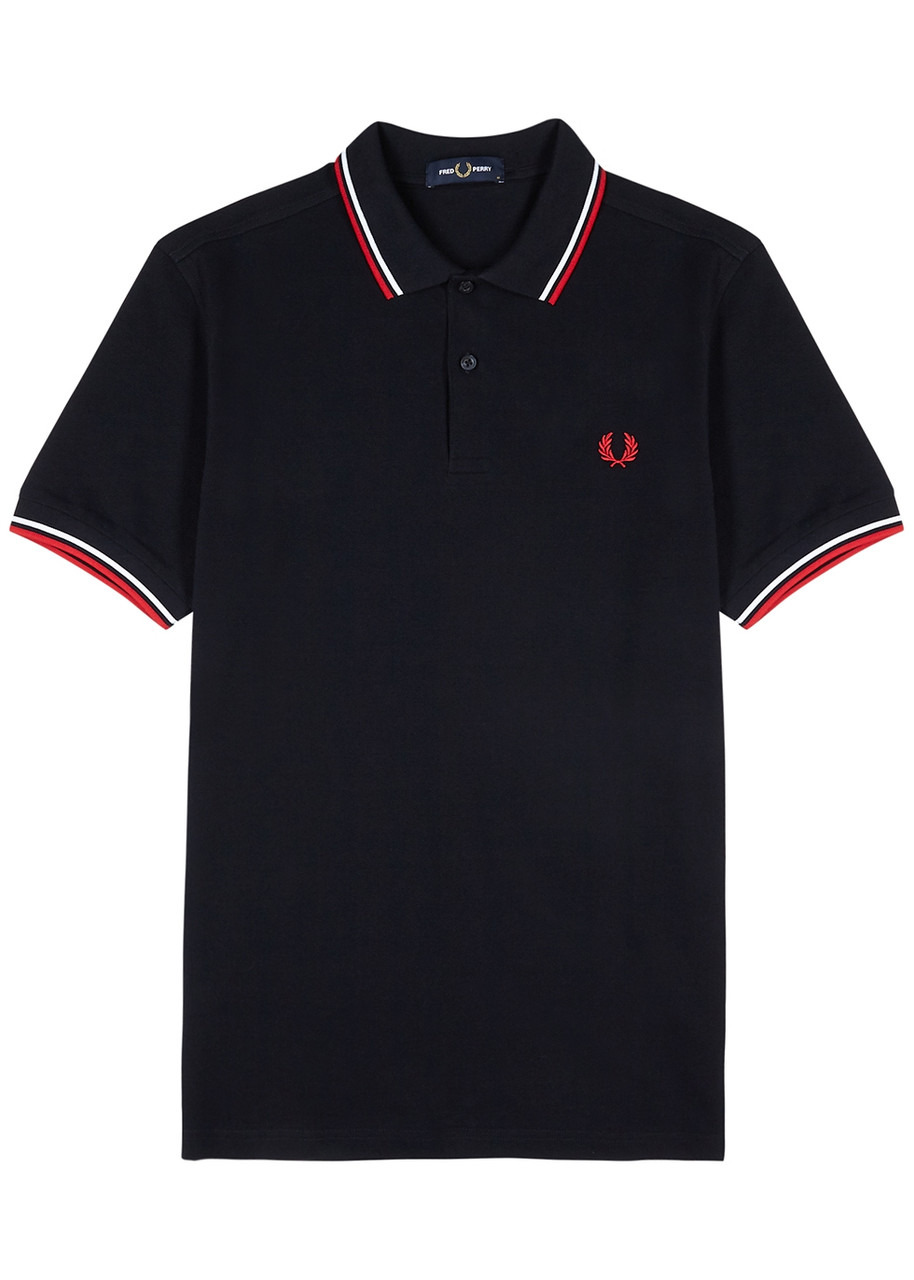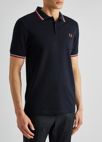 INFO & CARE - Fred Perry navy piqué cotton polo shirt - Button-fastening neck red embroidered designer crest red and white twin tipped ribbed trims - Slips on - 100% cotton SIZE & FIT - Machine wash - Length shoulder to hem: 28 inches/ 71cm - Midweight - Regular fit - Model is 6'1"/ 185cm chest size 38 inches and wears a size medium