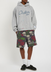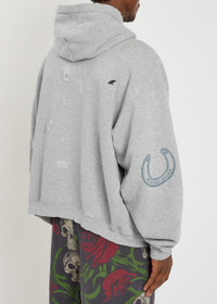 Info & Care Gallery Dept. cotton sweatshirt Ripped and distressed, paint-splatter effect, eyelets at hooded neck, dropped shoulders, printed front pouch pocket, ribbed trims Slips on; 90% cotton, 10% polyester Machine wash Size & Fit Length shoulder to hem: 25 inches/ 63.5cm Midweight Oversized, boxy fit Model is 6'1"/ 186cm, chest size 38.5 inches and wears a size medium