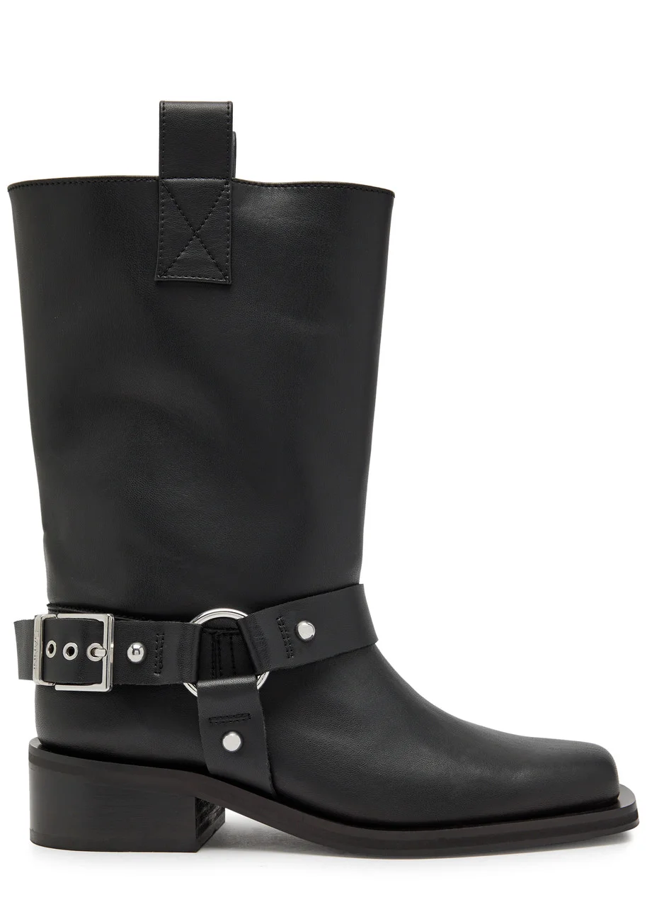 Info & Care GANNI faux leather mid-calf biker boots; Block heel measures approximately 1.75 inches/ 40mm; Buckle-fastening straps, stud embellishments, pull tabs, designer-engraved hardware, square toe; Pull-on; Size & Fit Only available in full sizes, go up to the nearest whole size if you take a half size;