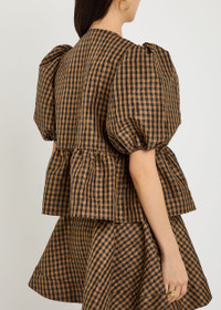 Info & Care GANNI taffeta;blouse Checked, round-neck, puff sleeves, elasticated cuffs, peplum hem, crinkled finish Tie fastenings through front 100% recycled polyester Dry clean Size & Fit Length shoulder to hem: 21 inches/ 53.5cm Midweight Fit and flare style Model is 5'10"/ 178cm and wears a size;FR36