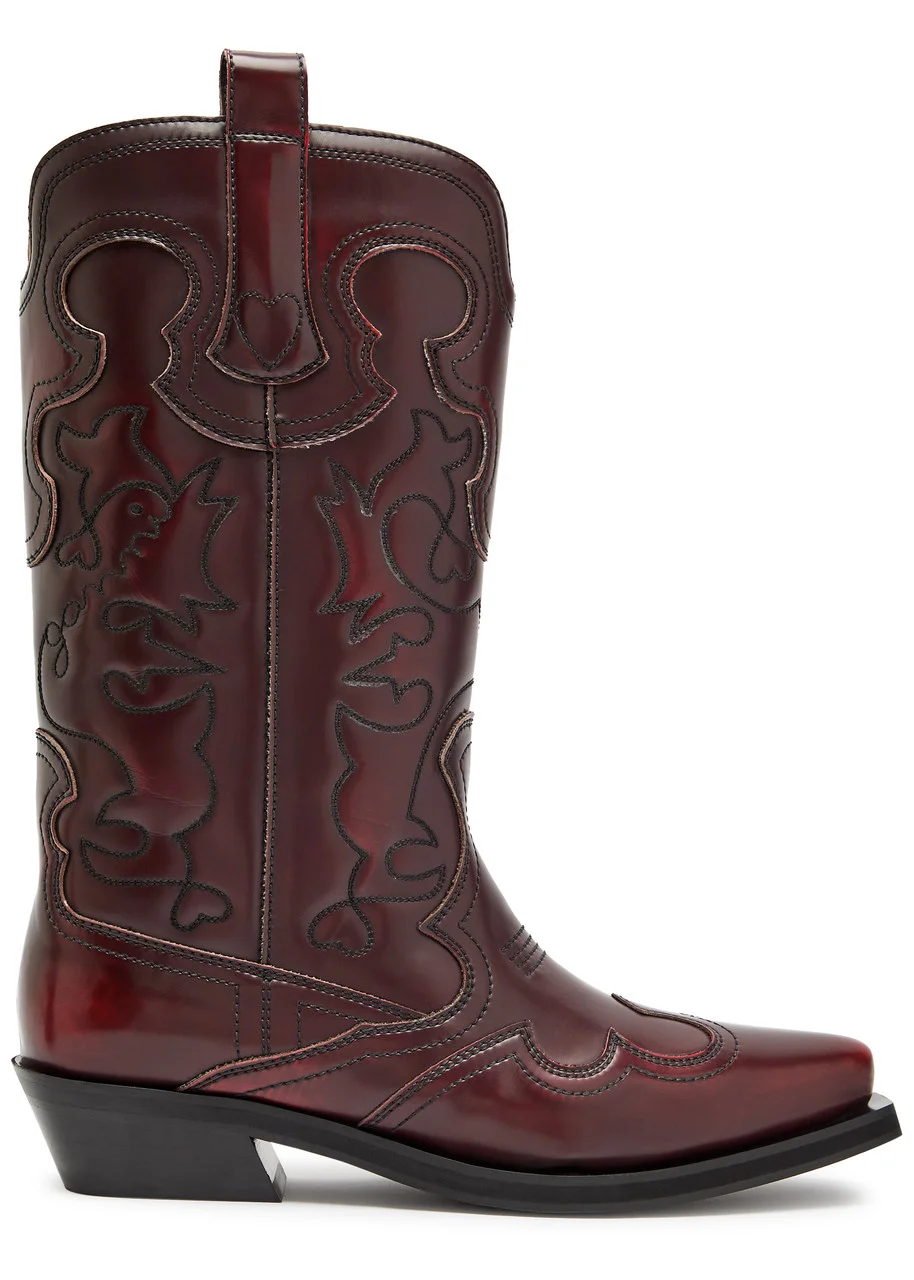 Info & Care GANNI faux leather mid-calf;western;boots; Western design, panelled, embroidery, pull tabs,;pointed square toe; Pull-on; Size & Fit Narrow across the toe; Only available in full sizes, go up to the nearest whole size if you take a half size;