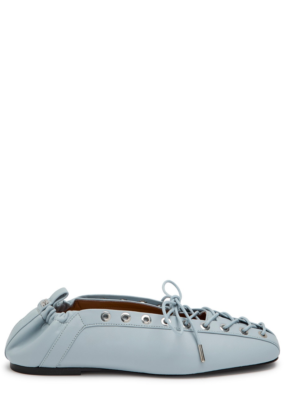 Info & Care Ganni faux leather ballet flats Eyelet embellishments, designer;plaque at partially elasticated heel, heel tab, stacked wooden heel, rubber;sole, almond toe Lace-up front Size & Fit Only available in full sizes, go up to the nearest whole size if you take a half size;