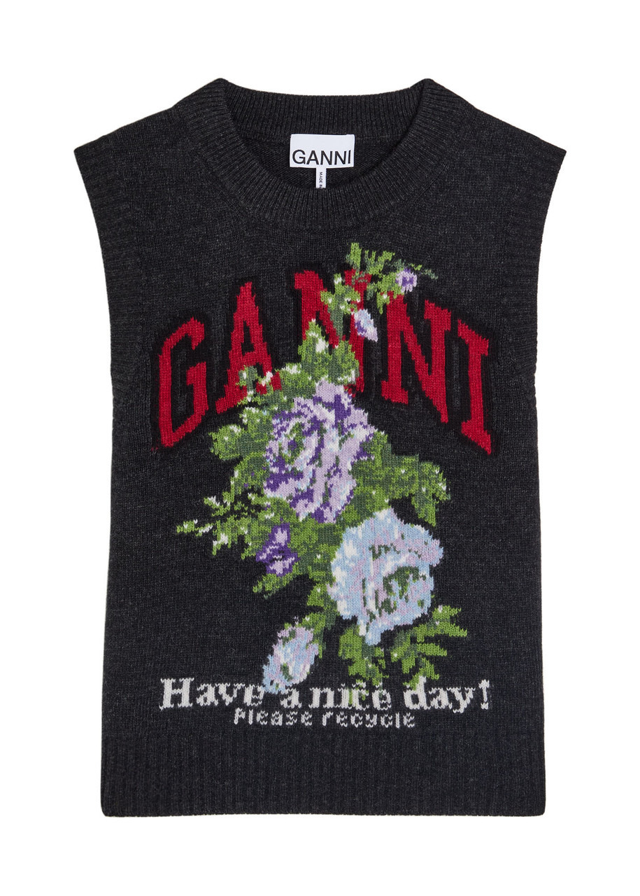 Info & Care Ganni wool-blend vest Logo and floral intarsia, crew-neck, ribbed trims Slips on 45% wool, 35% recycled wool, 20%;polyamide Hand wash; Size & Fit Length shoulder to hem: 20 inches/ 51cm Midweight Regular fit Model is 5'9"/ 175cm and wears a size small;
