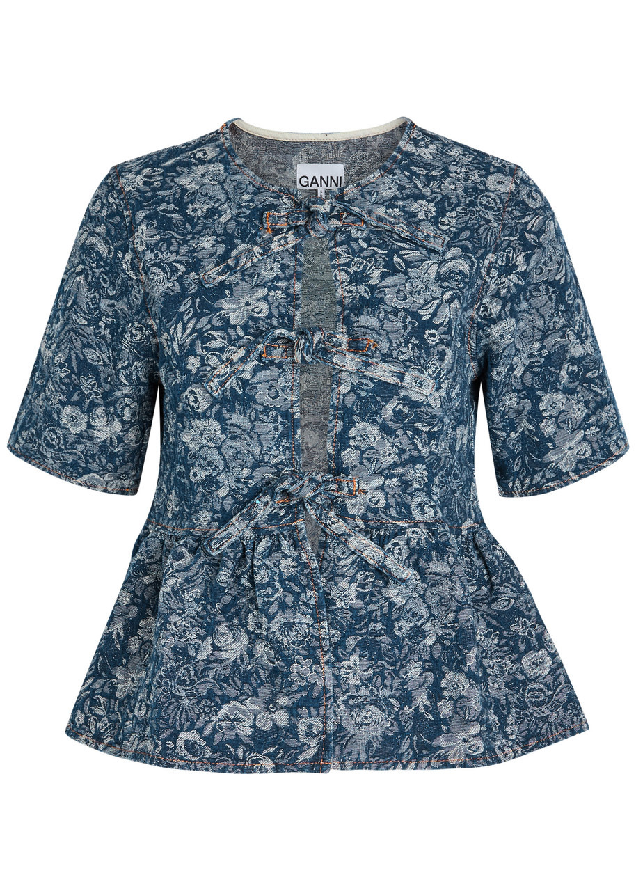 Info & Care GANNI denim;blouse Textured floral jacquard, crew-neck, keyholes through front, pleated peplum hem, contrast stitching Tie fastenings through front 100% organic cotton Machine wash inside out to avoid colour transfer Coordinating item available Size & Fit Length shoulder to hem: 22 inches/ 56cm Midweight Slim bodice, flared hem Model is 5'10"/ 178cm and wears a size;FR36
