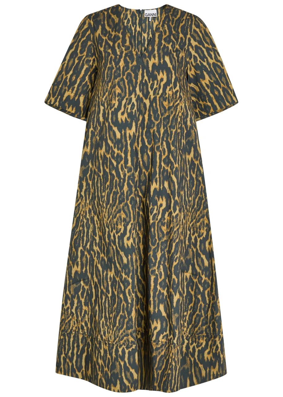 Info & Care GANNI stretch-cotton dress Leopard print, V-neck, side slip pockets Concealed zip fastening through back 97% cotton, 3% elastane Machine wash Size & Fit Length shoulder to hem: 47 inches/ 119.5cm Midweight Loose fit Model is 5'10"/ 178cm and wears a size;FR36
