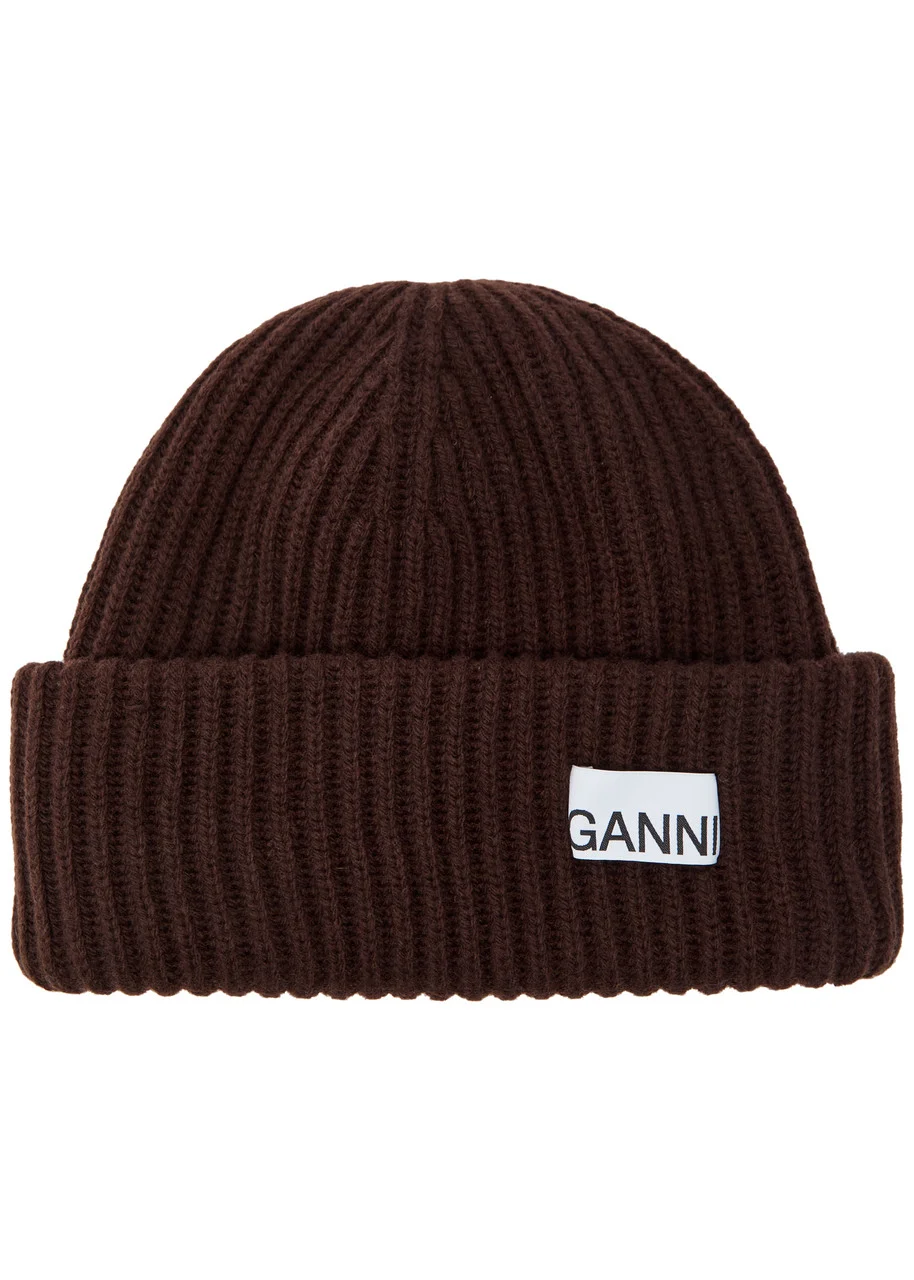 Ganni Logo-appliquéd Ribbed Wool-blend Beanie