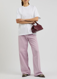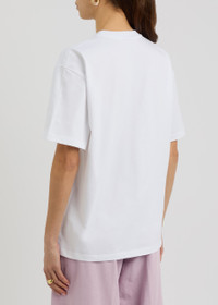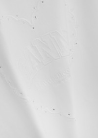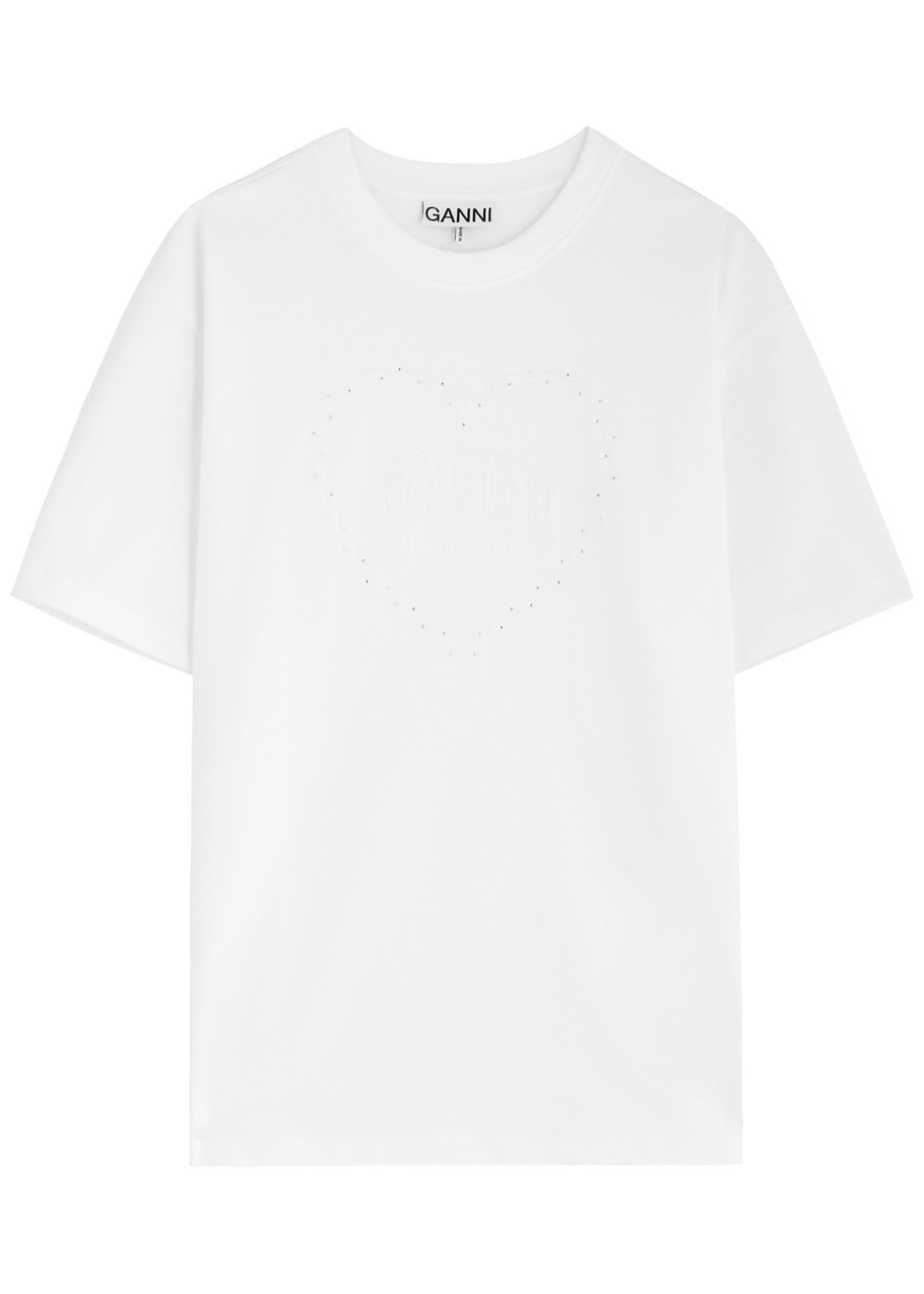 Info & Care Ganni cotton T-shirt; Crew-neck, dropped shoulders, logo and heart embroidery, crystal embellishments Slips on; 100% organic cotton; Machine wash; Size & Fit Length shoulder to hem: 27.5 inches/ 70cm Midweight; Relaxed, loose fit; Model is 5'10"/ 178cm and wears a size small;