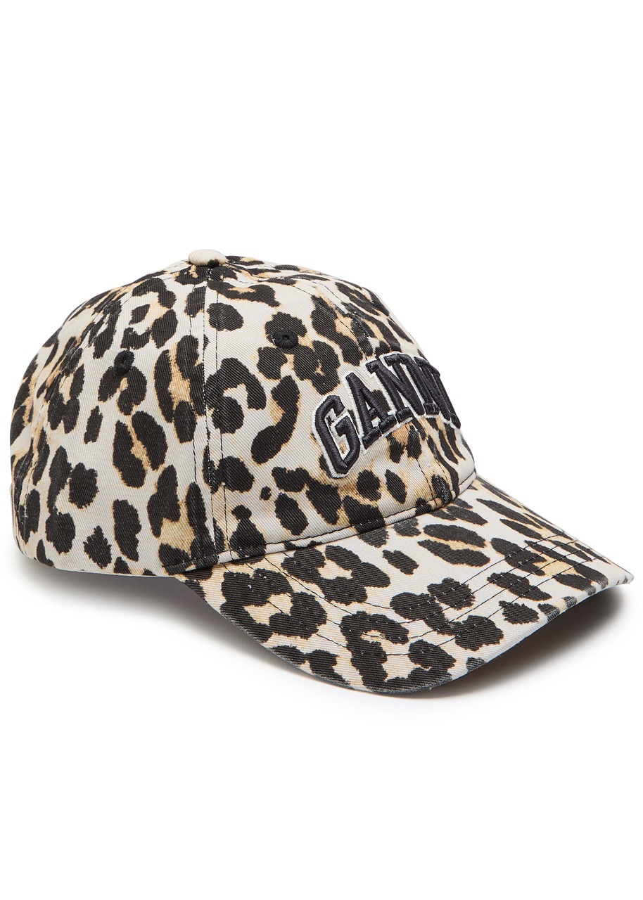 Info & Care Ganni;canvas cap Leopard printed, logo embroidered applique, concentric stitching at brim Adjustable strap at back 100% organic cotton Spot clean Size & Fit Brim depth: 7cm