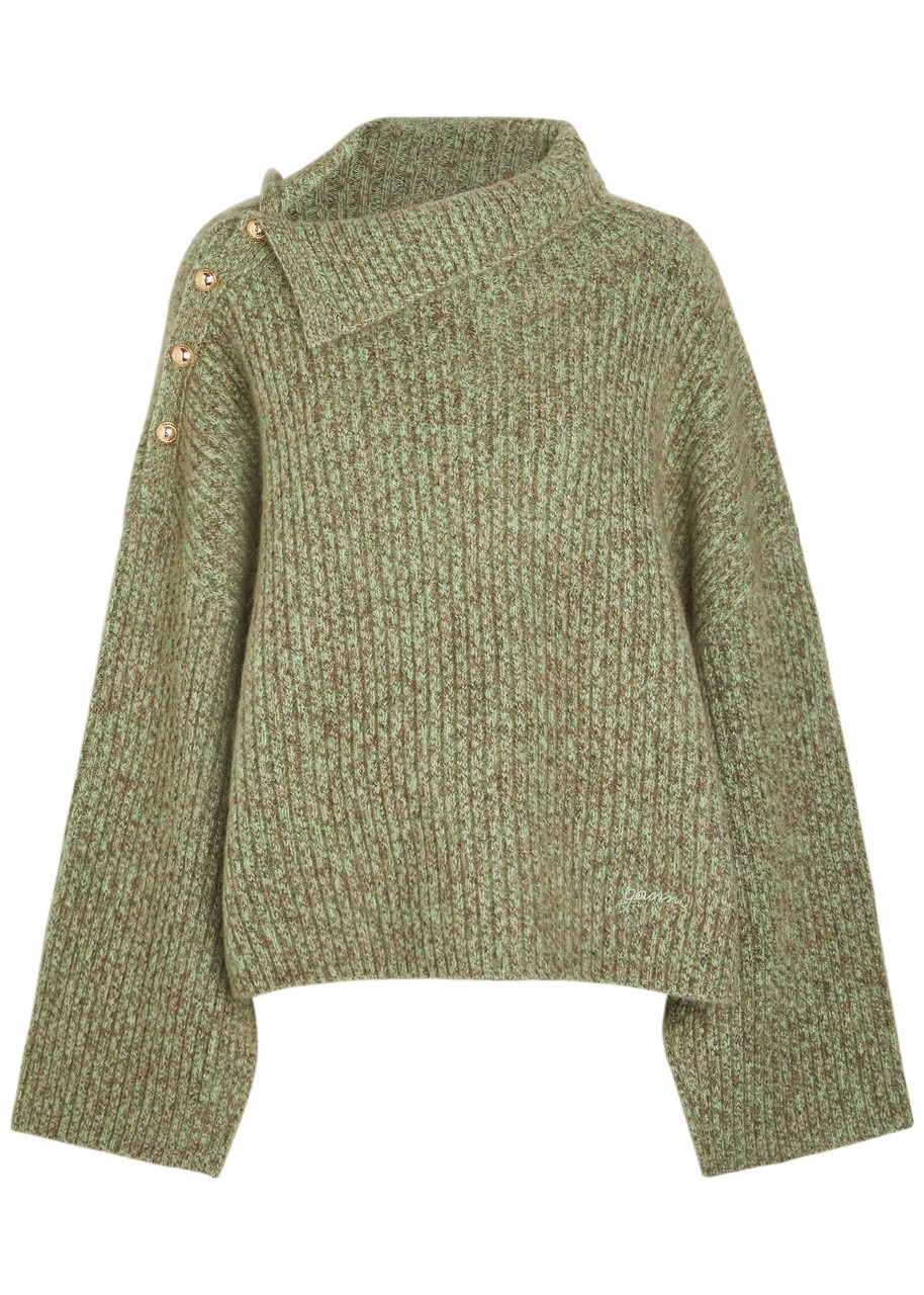 Info & Care Ganni brushed;wool-blend;jumper Melange, ribbed knit, asymmetric roll-neck with notched side, designer-engraved faux button fastenings at shoulder, dropped shoulders Slips on 39% wool, 30%;mohair, 29% polyester, 2% elastane Hand wash Size & Fit Length shoulder to hem: 22 inches/ 56cm Midweight Relaxed fit Model is 5'9"/ 175cm and wears a size small;