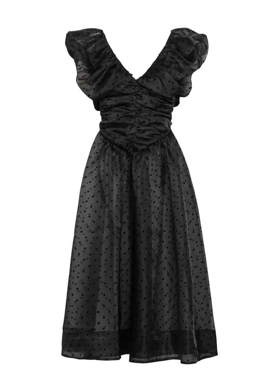 Info & Care GANNI organza dress Polka-dot print, V-neck, ruched bodice, internal slip dress lining Concealed zip fastening through side 100% recycled polyester; lining: 96% viscose, 4% elastane Hand wash Size & Fit Length shoulder to hem: 47 inches/ 119.5cm Midweight Slim bodice, relaxed through the skirt Model is 5'10"/ 178cm and wears a size;FR36