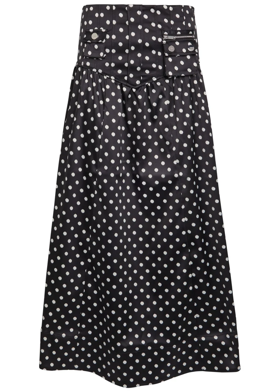 Info & Care GANNI satin skirt Polka dots, corset-effect panels through waist, press-stud fastening front flap pockets, dropped waist, pleated details, shirred back panel, curved hem, partially lined Concealed zip fastening at side; 91% recycled polyester, 9% elastane; lining: 94% recycled polyester, 6% elastane Hand wash Coordinating items available Size & Fit Length waist to hem: 39 inches/ 99cm Midweight Slim across the waist, full flared skirt Model is 5'10"/ 178cm and wears a size;FR36