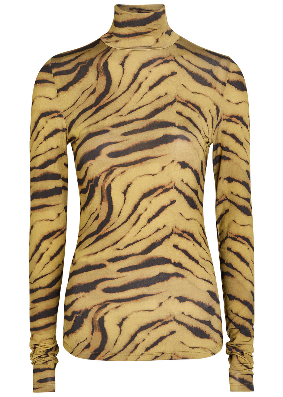 Info & Care GANNI stretch-jersey top Printed, turtleneck Slips on 95% viscose, 5% elastane Dry clean Size & Fit Length shoulder to hem: 27 inches/ 68.5cm Midweight Slim fit Model is 5'9"/ 175cm and wears a size;FR36