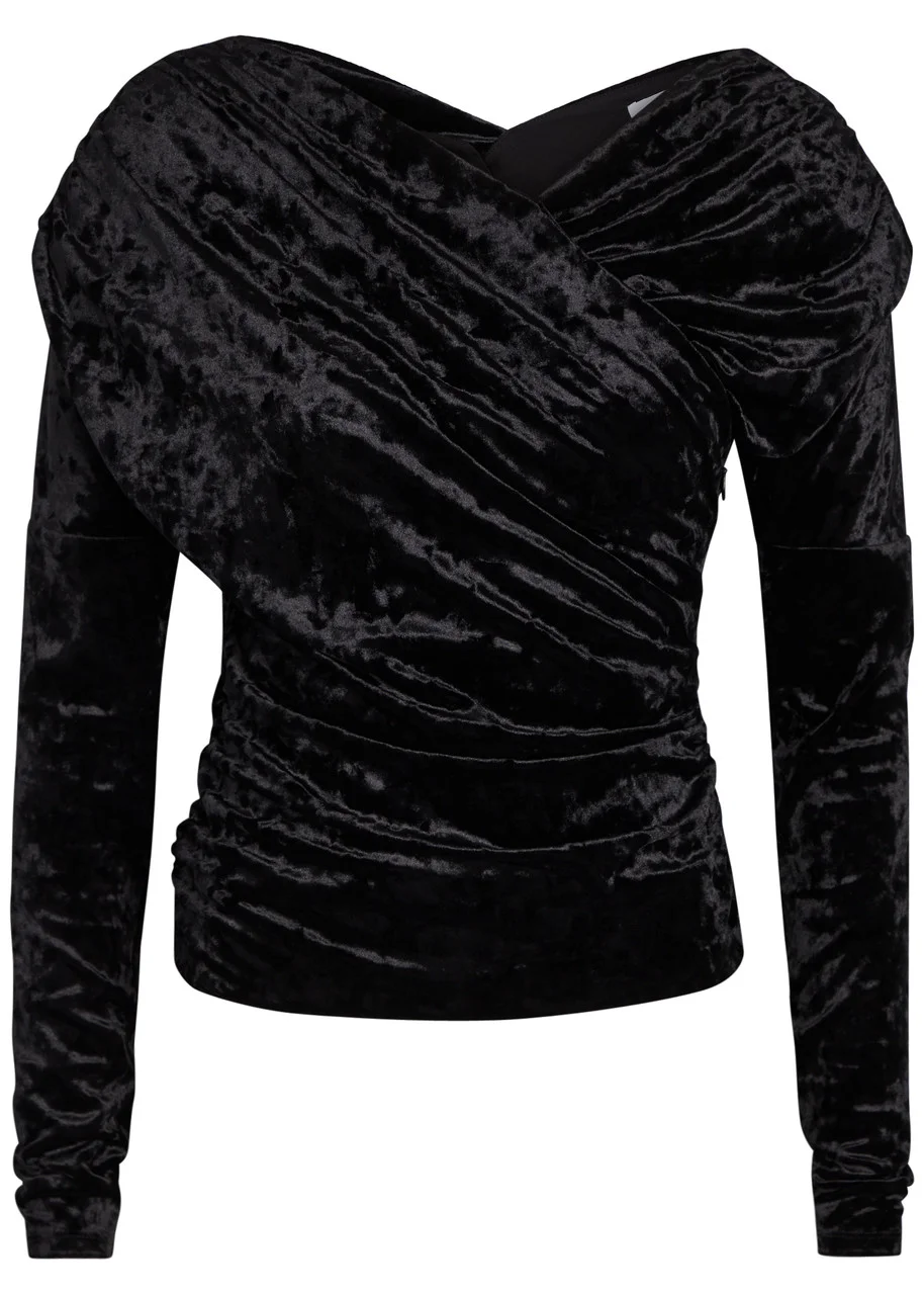 Info & Care GANNI velour blouse Ruched, asymmetric neck, partially lined Slips on 90% recycled polyester, 10% elastane; lining: 95% lyocell, 5% elastane Machine wash Size & Fit Length shoulder to hem: 24 inches/ 61cm Midweight Slim fit Model is 5'10"/ 178cm and wears a size;FR36