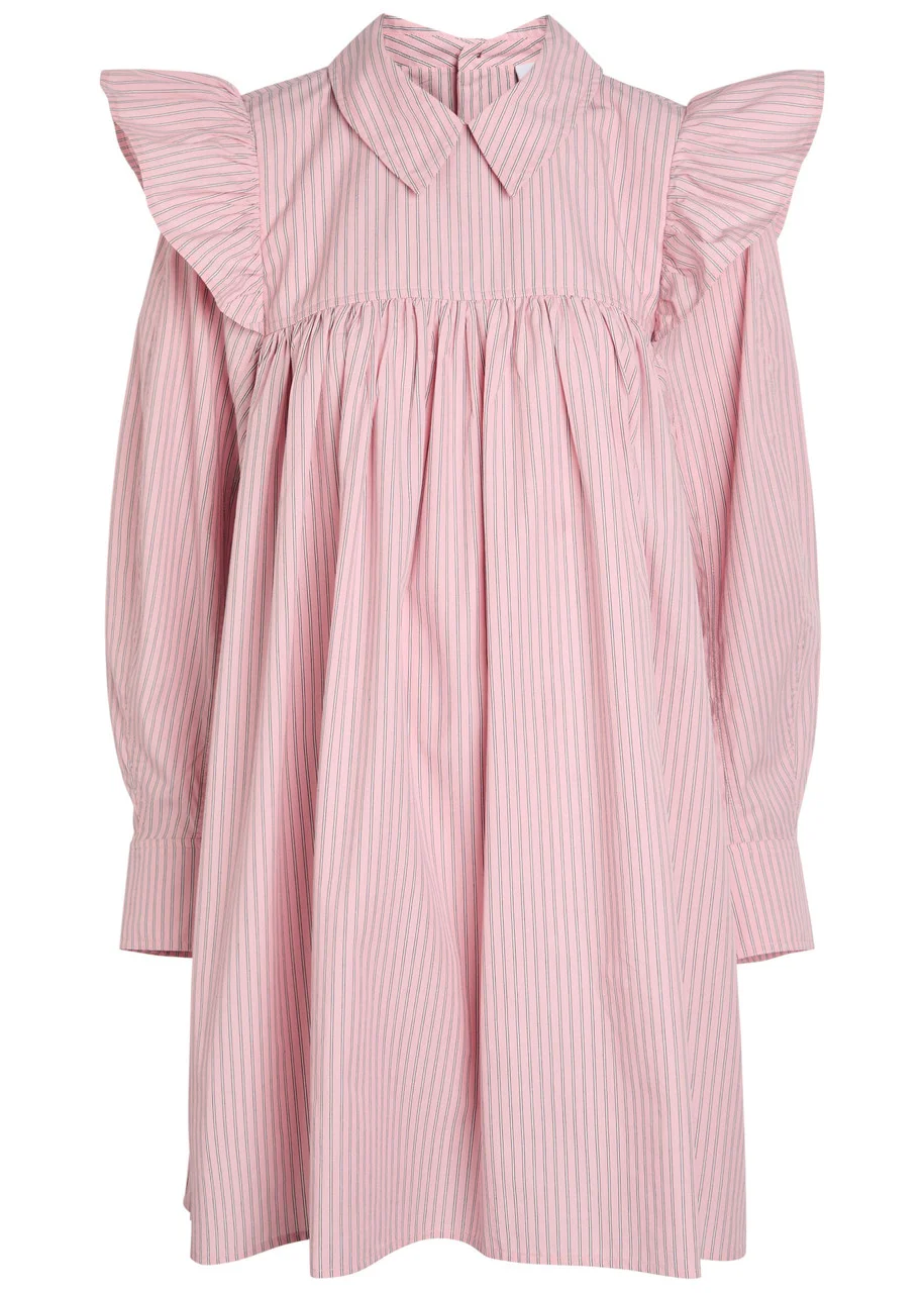 Info & Care GANNI cotton-poplin;shirt dress Striped, flutter sleeve-effect frilled trim, rounded sleeves, button-fastening cuffs, pleats at bust Button fastenings at back 100% organic cotton Machine wash Size & Fit Length shoulder to hem: 34 inches/ 86.5cm Midweight Flared style, slim across bust Model is 5'10"/ 178cm and wears a size;FR36