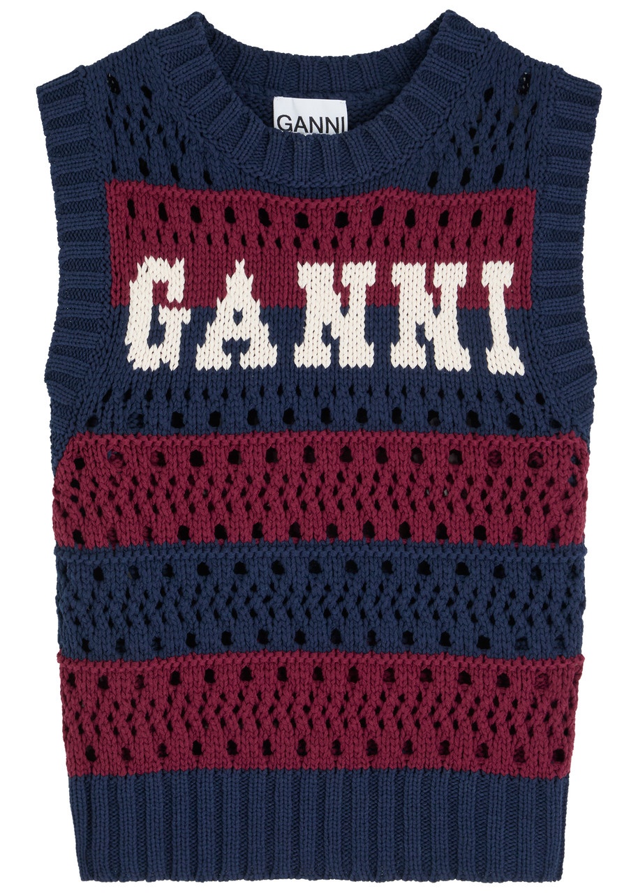 Info & Care Ganni knitted;vest Striped, crew-neck, logo intarsia at chest, ribbed trims Slips on 50% recycled cotton, 50% recycled polyester Hand wash; Size & Fit Length shoulder to hem: 20.5 inches/ 52cm Midweight Regular fit Model is 5'9"/ 175cm and wears a size small