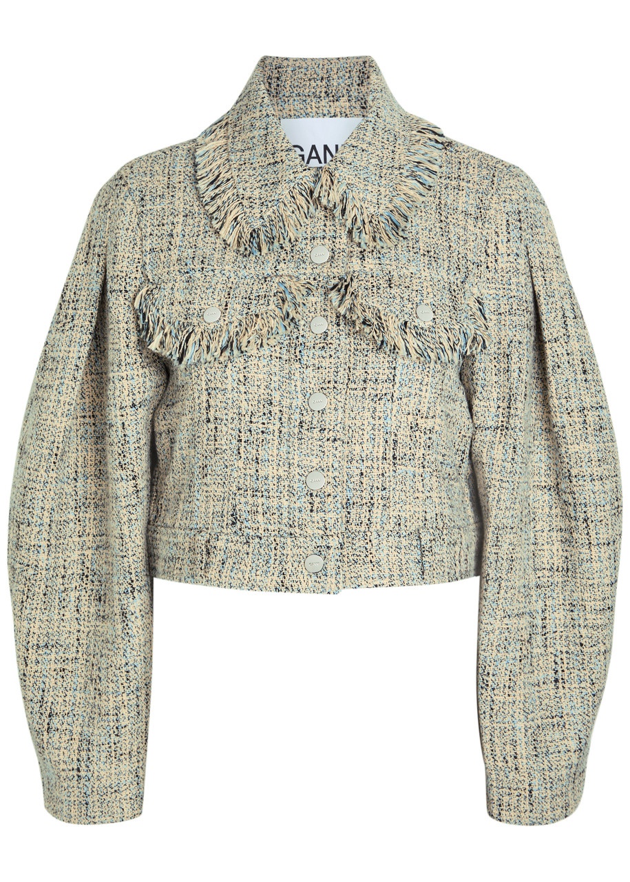 Info & Care Ganni tweed jacket Barrel sleeves, press-stud flap pockets, belt loops and adjustable press-stud fastening tabs at hem, fringed details, designer-engraved hardware, partially lined Press-stud fastenings through front 100% organic cotton; lining: 100% viscose Machine wash Co-ordinating items available; Size & Fit Length shoulder to hem: 17 inches/ 43cm Midweight Boxy fit Model is 5'10"/ 178cm and wears a size;FR38