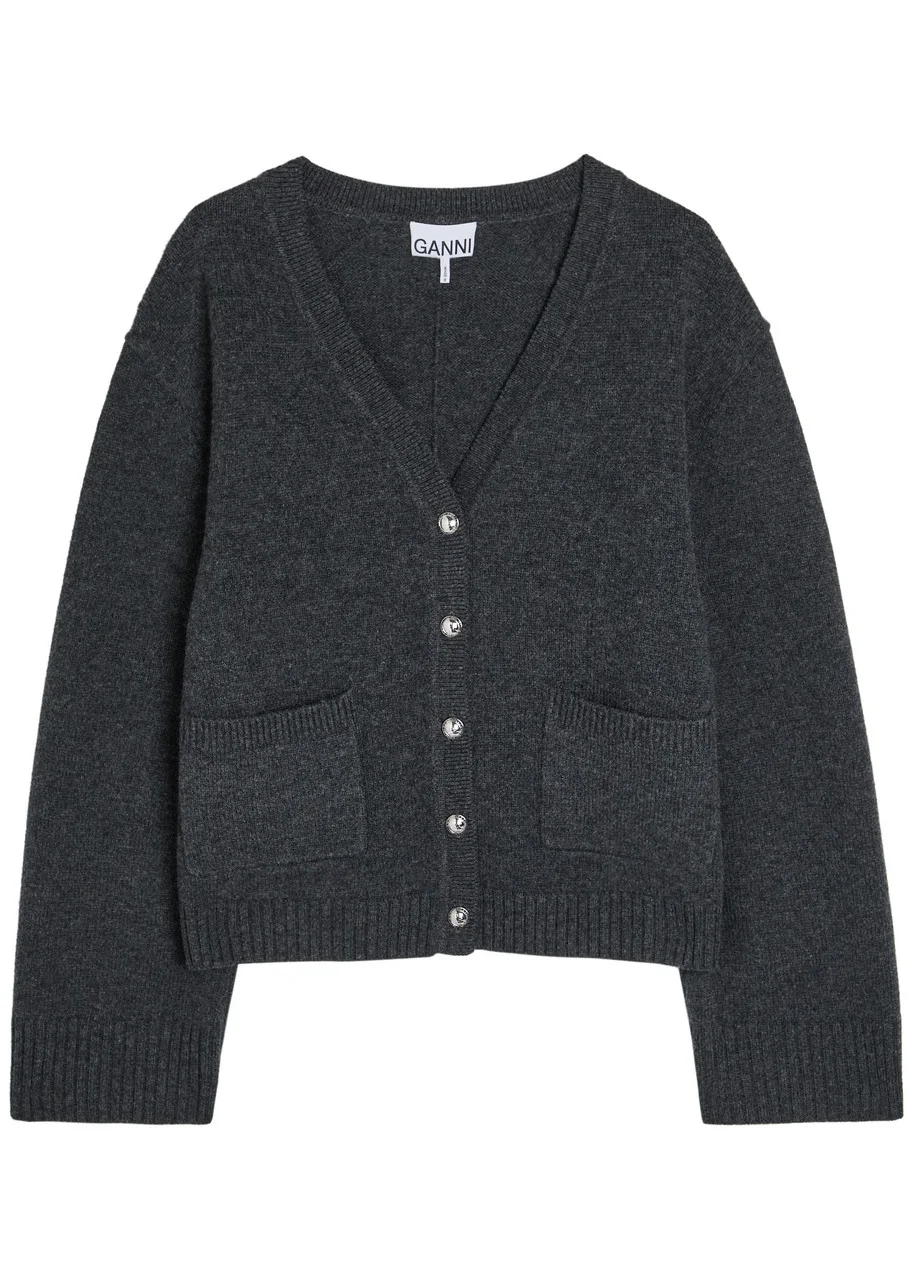 Info & Care GANNI wool;cardigan V-neck, dropped shoulders, front patch pockets, side splits, ribbed trims Button fastenings through front 100% wool Hand wash; Size & Fit Length shoulder to hem: 23 inches/ 58.5cm Midweight Relaxed fit Model is 5'9"/ 175cm and wears a size small