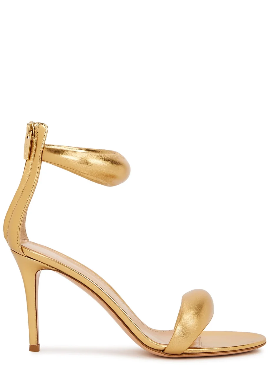 Product Details Hand-finished Aquazzura gold leather sandals Heel measures approximately 3.5 inches/ 85mm Padded straps open toe Zip fastening at heel