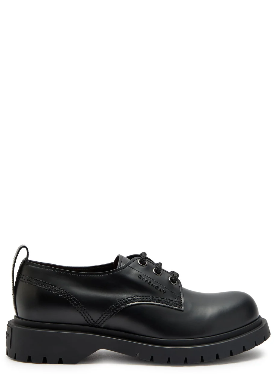 Info & Care Givenchy leather Derby shoes Rubberised logo at side, heel tab, gripped rubber sole, round toe Lace-up front Size & Fit Only available in full sizes, go up to the nearest whole size if you take a half size