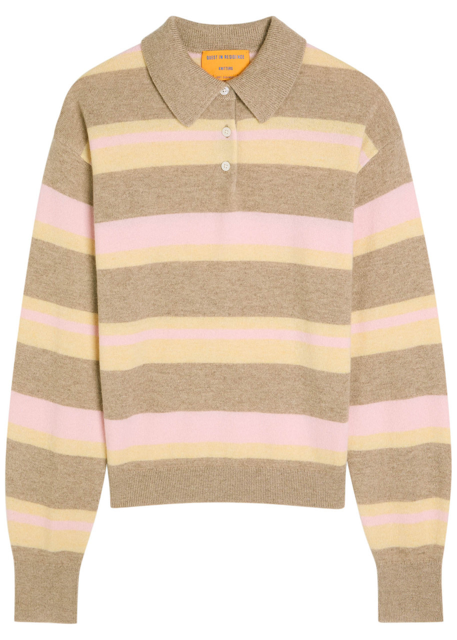 Info & Care Guest In Residence cashmere polo Striped intarsia, button-fastening neck, dropped shoulders, ribbed trims; Slips on 100% cashmere Hand wash; Size & Fit Length shoulder to hem: 21 inches/ 53cm Midweight Regular fit Model is 5'9"/ 175cm and wears a size small