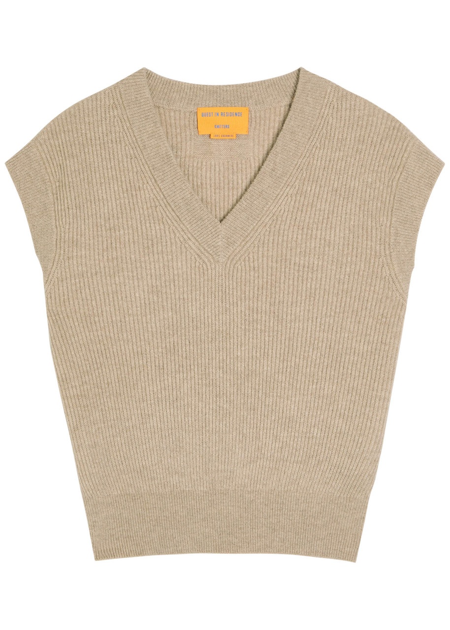 Info & Care Guest In Residence cashmere vest Ribbed, V-neck Slips on 100% cashmere Hand wash Size & Fit Length shoulder to hem: 20 inches/ 51cm Midweight Regular fit Model is 5'9"/ 175cm and wears a size small