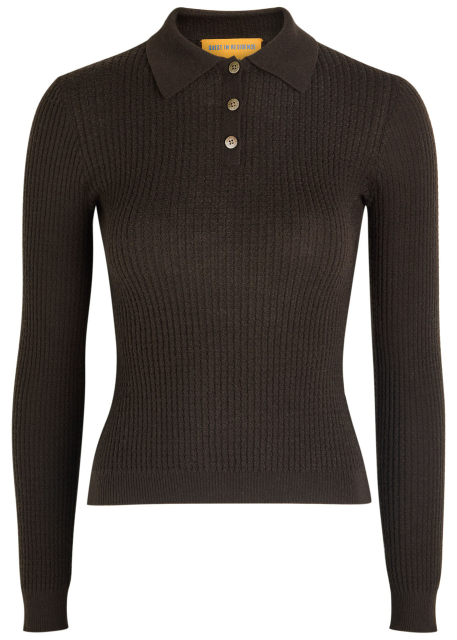 Info & Care Guest In Residence cashmere;top Waffle-knit, button-fastening neck, ribbed trims Slips on 100% cashmere Hand wash Size & Fit Length shoulder to hem: 20 inches/ 51cm Midweight Slim fit Model is 5'10"/ 178cm and wears a size small