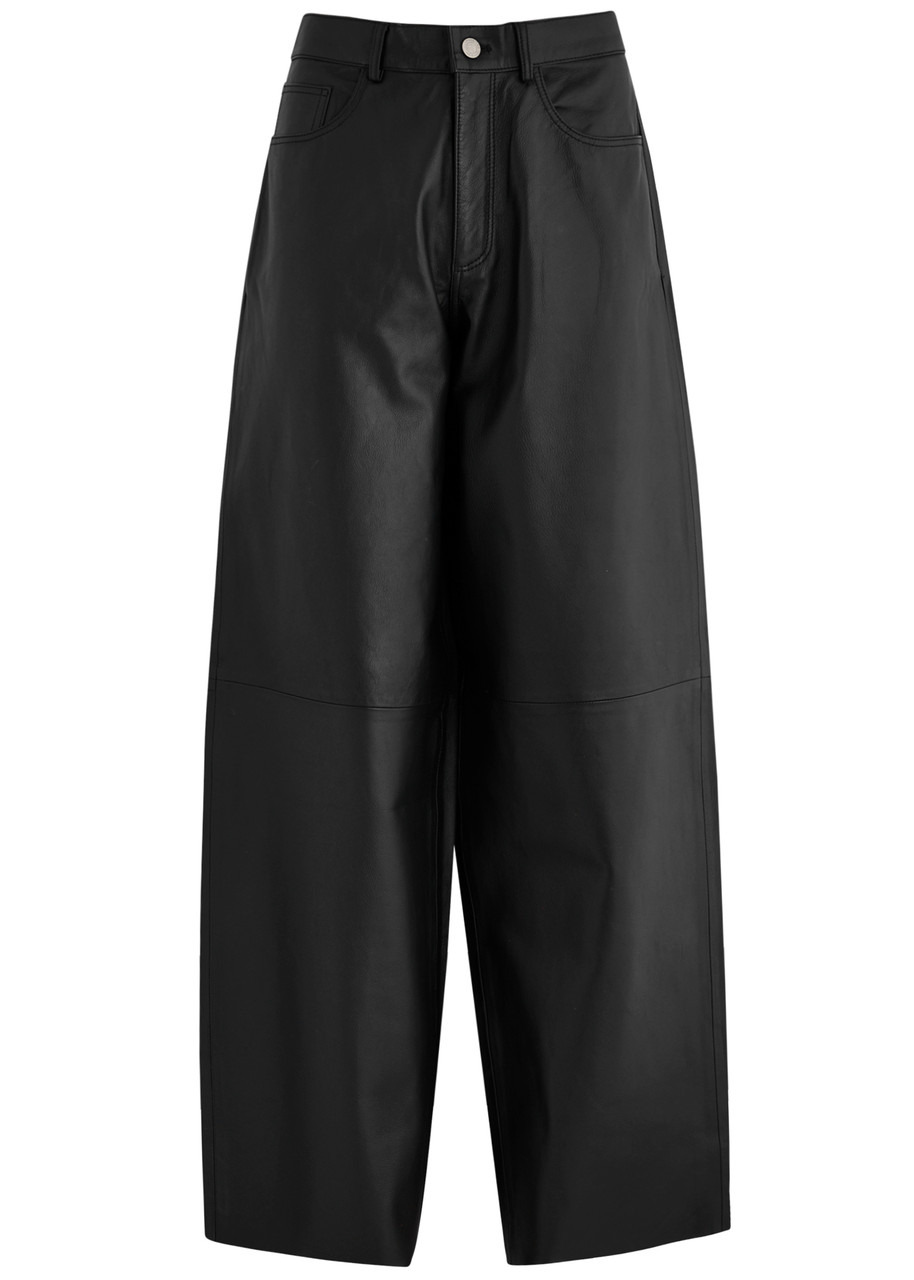 Info & Care Haikure leather trousers Belt loops,;three front slip pockets, two back patch pockets Partially concealed zip and button fastenings at front 100% leather Specialist clean Size & Fit Inside leg length: 32 inches/ 81cm Midweight Wide-leg cut Model is 5'9"/ 175cm and wears a size W27