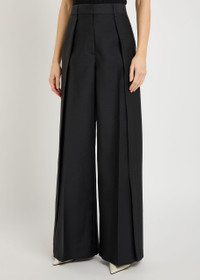 Info & Care Heirlome wool and silk-blend trousers Overlapping panels at sides, belt loops, pressed crease through legs,;side splits through legs, button-fastening back slit pockets Concealed button, zip and hook fastening at;front 68% wool, 32%;silk Dry clean; Size & Fit Inside leg length: 32 inches/ 81.5cm Midweight Wide-leg cut, high-rise fit Tailored style Model is 5'9"/ 175cm and wears a size small;