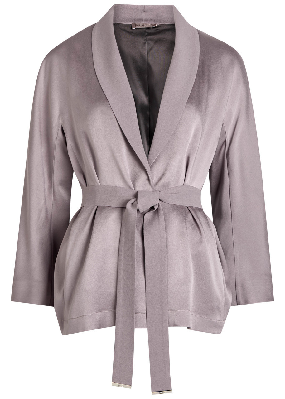 Info & Care Herno satin blazer Shawl lapels, dolman sleeves, belt loops, tie-fastening belt, side slip pockets, designer plaque at back neck, fully lined Concealed push-stud fastening at front 72% acetate, 28% viscose; lining: 65% acetate, 35% polyester Dry clean Size & Fit Length shoulder to hem: 26 inches/ 66cm Midweight Loose fit, use belt to cinch the waist Model is 5'10"/ 178cm and wears a size;IT40