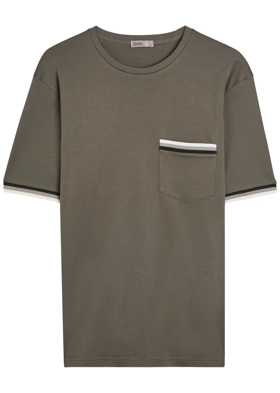 Info & Care Herno cotton T-shirt Ribbed striped trims, crew-neck, chest patch pocket, designer plaque at back neck Slips on 100% cotton Machine wash Size & Fit Length shoulder to hem: 28 inches/ 71cm Midweight Relaxed fit Model is 6'1"/ 185cm, chest size 38.5 inches and wears a size medium