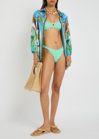 Info & Care Hunza G seersucker bikini Top: Thin shoulder straps, bandeau-style, pearlescent hoop detail at front Briefs: pearlescent;hoop details at hips 97% polyamide, 3% elastane Machine wash; Size & Fit High-cut leg; One size; will comfortably fit a size UK6-UK14 Please note, this style may not be suitable for;larger busts