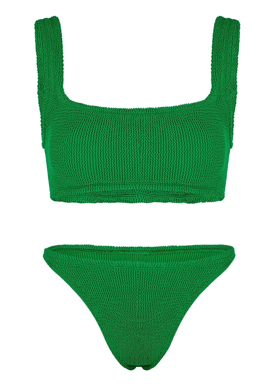 Info & Care Hunza G crinkle bikini The Original Crinkle material Top: square-neck, low back, slips on; Briefs: elasticated, pull on 88% nylon, 12% elastane; Hand wash; Size & Fit One size will comfortably fit a size UK6-UK16;