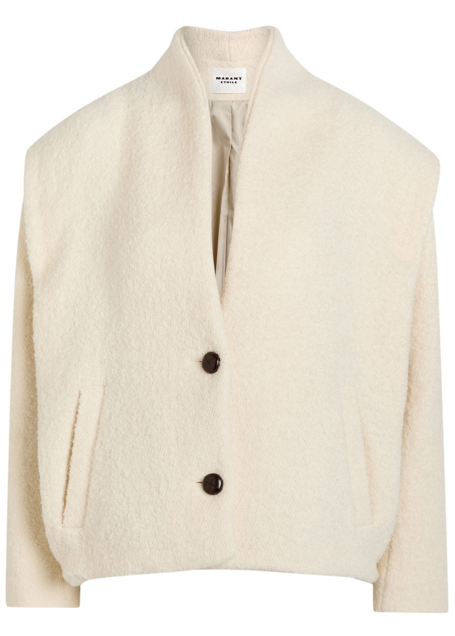 Info & Care Isabel Marant Etoile boucle;jacket Stand collar, overlay-effect pleat at shoulders, side slip pockets,;fully lined Button fastenings at front 31% acrylic, 27% polyester, 14% alpaca, 14% virgin wool, 8% wool, 6% other fibres; lining: 100% cotton Dry clean; Size & Fit Length shoulder to hem: 25 inches/ 63.5cm Midweight Relaxed fit, boxy;style Model is 5'9"/ 175cm and wears a size;FR36