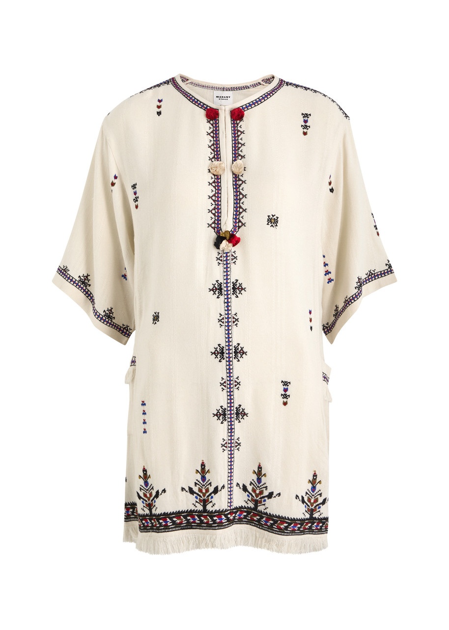 Info & Care Isabel Marant Etoile woven dress Embroidered, concealed hook-fastening neck, faux button embellishments at neck, two patch pockets, fringed hem, contrasting trims Slips on 100% viscose Dry clean Size & Fit Length shoulder to hem: 32.5 inches/ 82.5cm Midweight Loose fit Model is 5'10"/ 178cm and wears a size;FR38