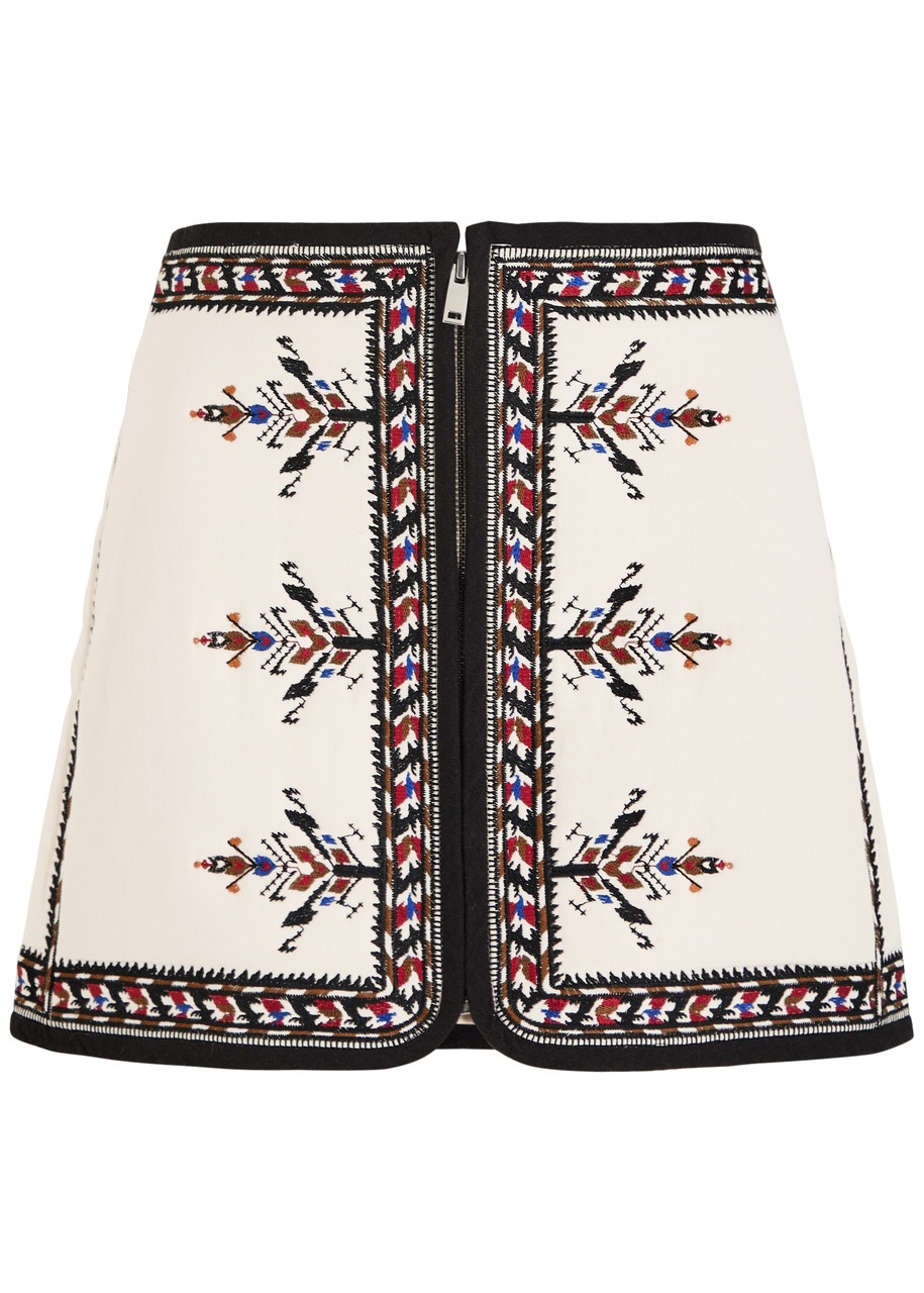 Info & Care Isabel Marant Etoile woven skirt; Padded, embroidered, back pockets, contrasting trims, fully lined Zip fastening through front 51% viscose, 35% cotton, 14% linen; lining; 100% cotton Dry clean Size & Fit Length waist to hem: 14.5 inches/ 37cm Midweight Slim fit Model is 5'10"/ 178cm and wears a size;FR38; Please note, this style is particularly short in length