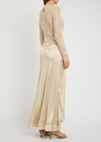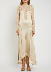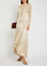 Info & Care Isabel Marant stretch-silk;gown Eyelash-trimmed guipure lace panel, round-neck, darts through waist,;jour echelle inserts through skirt, button-fastening keyhole at back neck, ruffled trim at hem, scalloped trims, longer back hem Concealed zip fastening at;side 96% silk, 4% elastane; Dry clean; Size & Fit Length shoulder to hem: 52 inches/ 132.5cm; back: 60 inches/ 152.5cm Midweight Slim bodice Loose from the lower hips; Model is 5'9"/ 175cm and wears a size;FR36