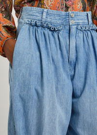 Info & Care Isabel Marant denim trousers Belt loops, drawstring-effect gathered detail at waist, side slip pockets, pleated details, two back patch pockets, faded finish Partially concealed button and zip fastenings at front 100% cotton Machine wash inside out to avoid colour transfer Size & Fit Inside leg length: 31 inches/ 79cm Midweight Barrel-leg cut Model is 5'10"/ 178cm and wears a size FR36