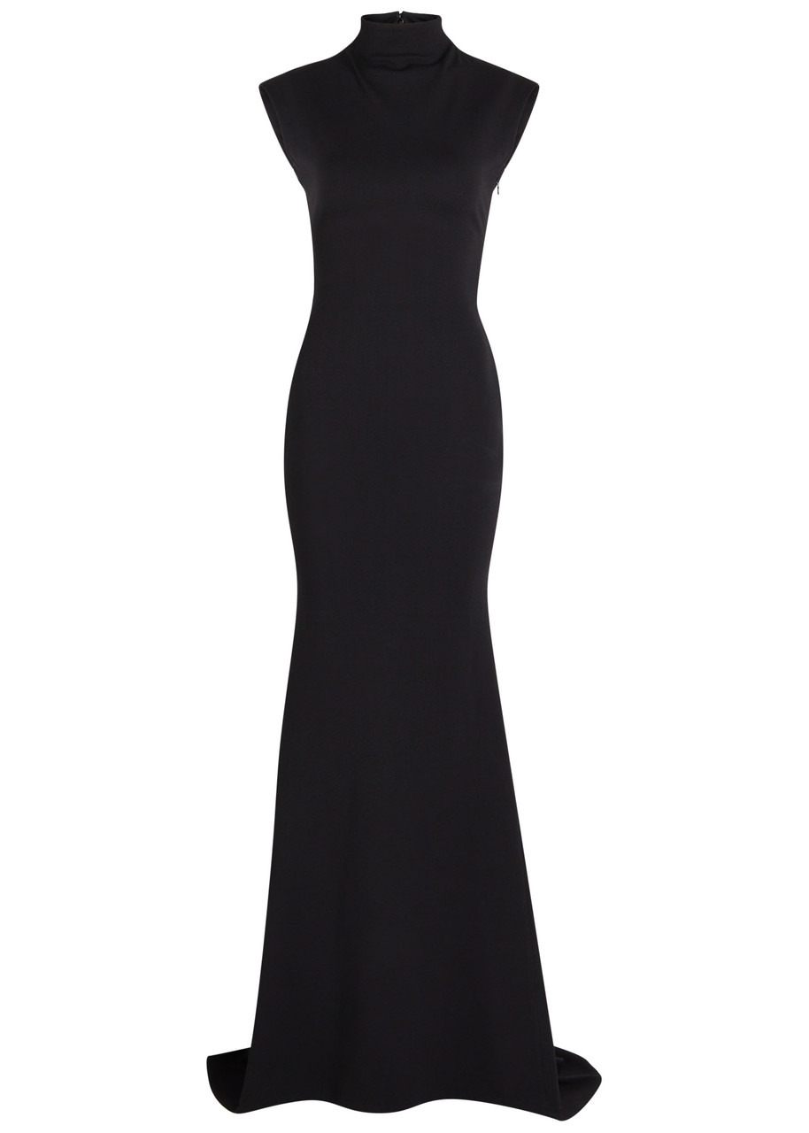 Info & Care Jacquemus crepe gown High-neck, curved hem, longer back hem Concealed zip fastening 78% viscose, 16% polyamide, 6% elastane Dry clean Size & Fit Length shoulder to hem: 61 inches/ 175cm; back: 69 inches/ 195cm Midweight Slim fit, relaxed from the hips Model is 5'8"/172cm and wears a size FR36
