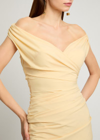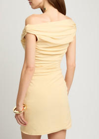 Info & Care Jacquemus jersey dress Draped off-the-shoulder neckline, gathered details, underwired padded cups, fully lined Concealed hook and zip fastening at side Fabric 1: 82% polyester, 18% elastane; fabric 2: 100% cotton; lining 1: 69% polyamide, 31% elastane; lining 2: 55% cotton, 45% polyester Specialist wet clean Size & Fit Length shoulder to hem: 32 inches/ 81cm Midweight Close fit Model is 5'9"/ 175cm and wears a size;FR36;