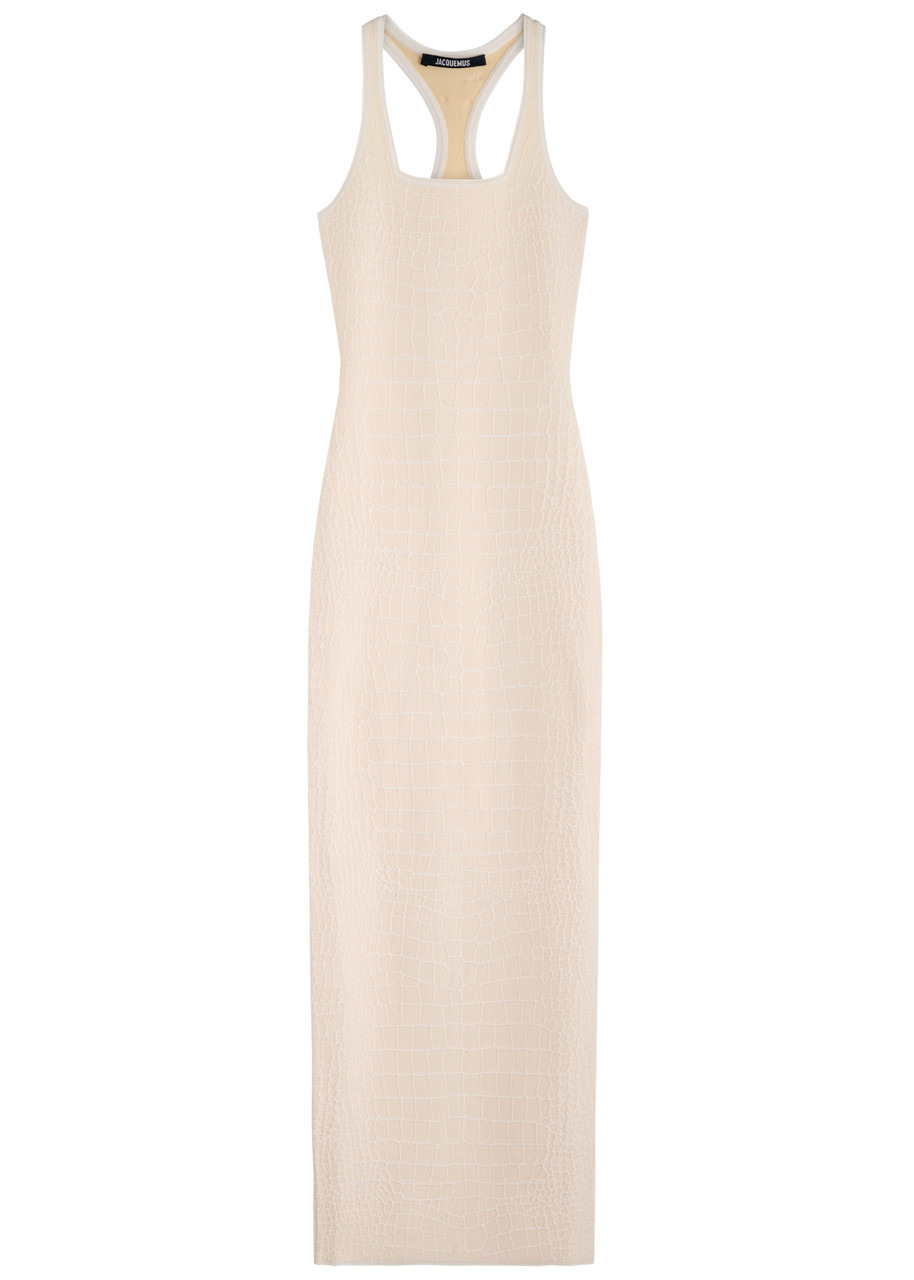 Info & Care Jacquemus stretch-knit dress Square neck, embossed crocodile-effect intarsia, racer back, logo tab applique at back, back vent, ribbed rolled trims; Slips on; 72% viscose, 25% polyamide, 3% elastane; Hand wash; Size & Fit Length shoulder to hem: 57 inches/ 145cm Midweight; Slim fit; Model is 5'9"/ 175cm and wears a size;FR36
