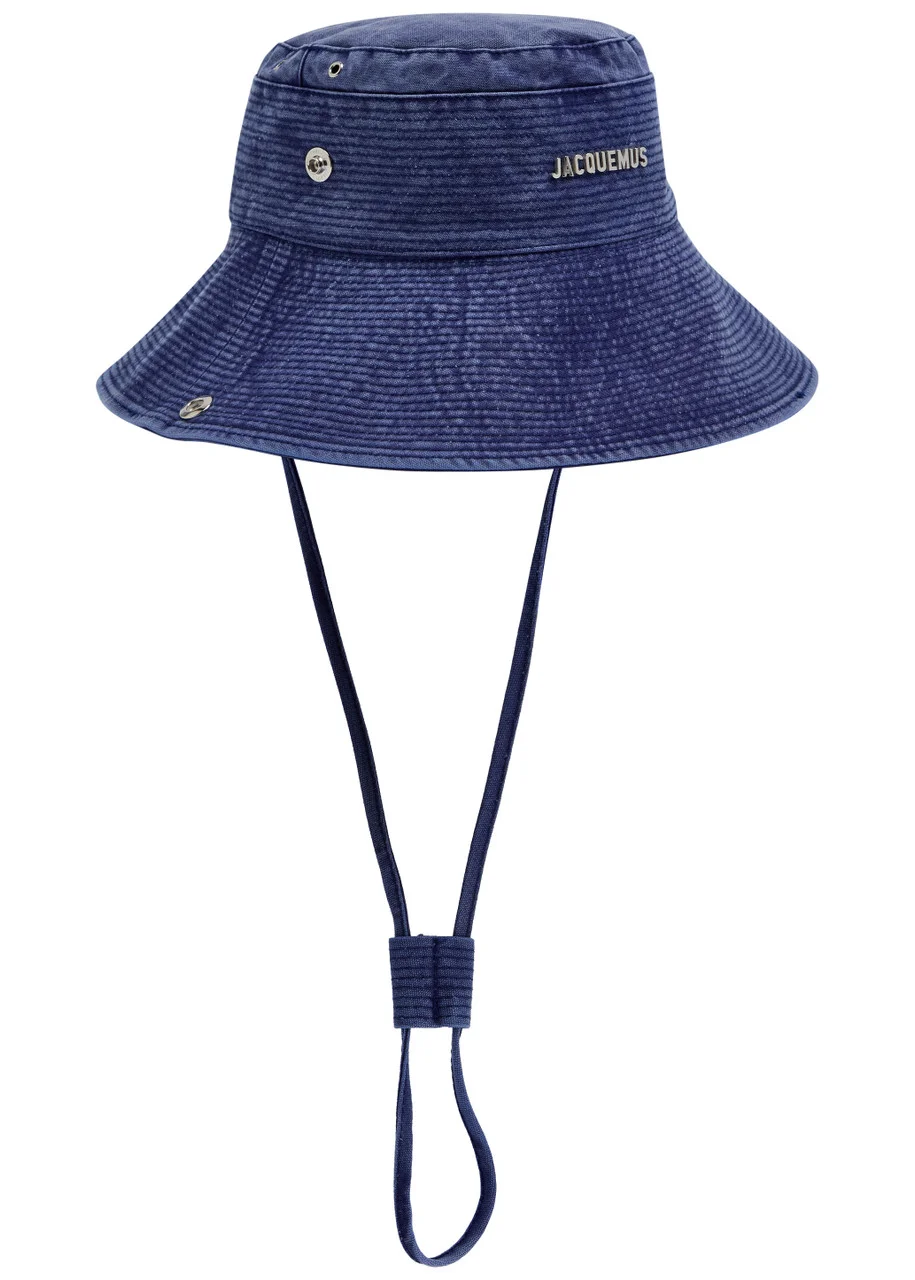 Info & Care Jacquemus flocked denim bucket hat Logo plaque, geometric eyelet embellishments, press-stud fastening brim at sides, adjustable canvas back tab, designer-engraved hardware, adjustable drawstring neck ties, fully lined 100% cotton Hand wash Size & Fit Brim depth: 9cm